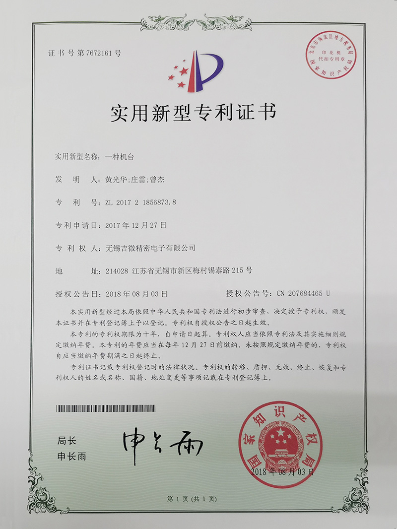 一種機臺實用新型專利證書